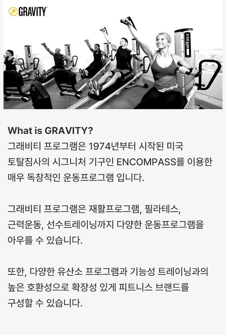 그래비티 프로그램은 토탈짐사의 엔컴파스라는 독창적인 기구를 이용한 운동 프로그램 입니다.