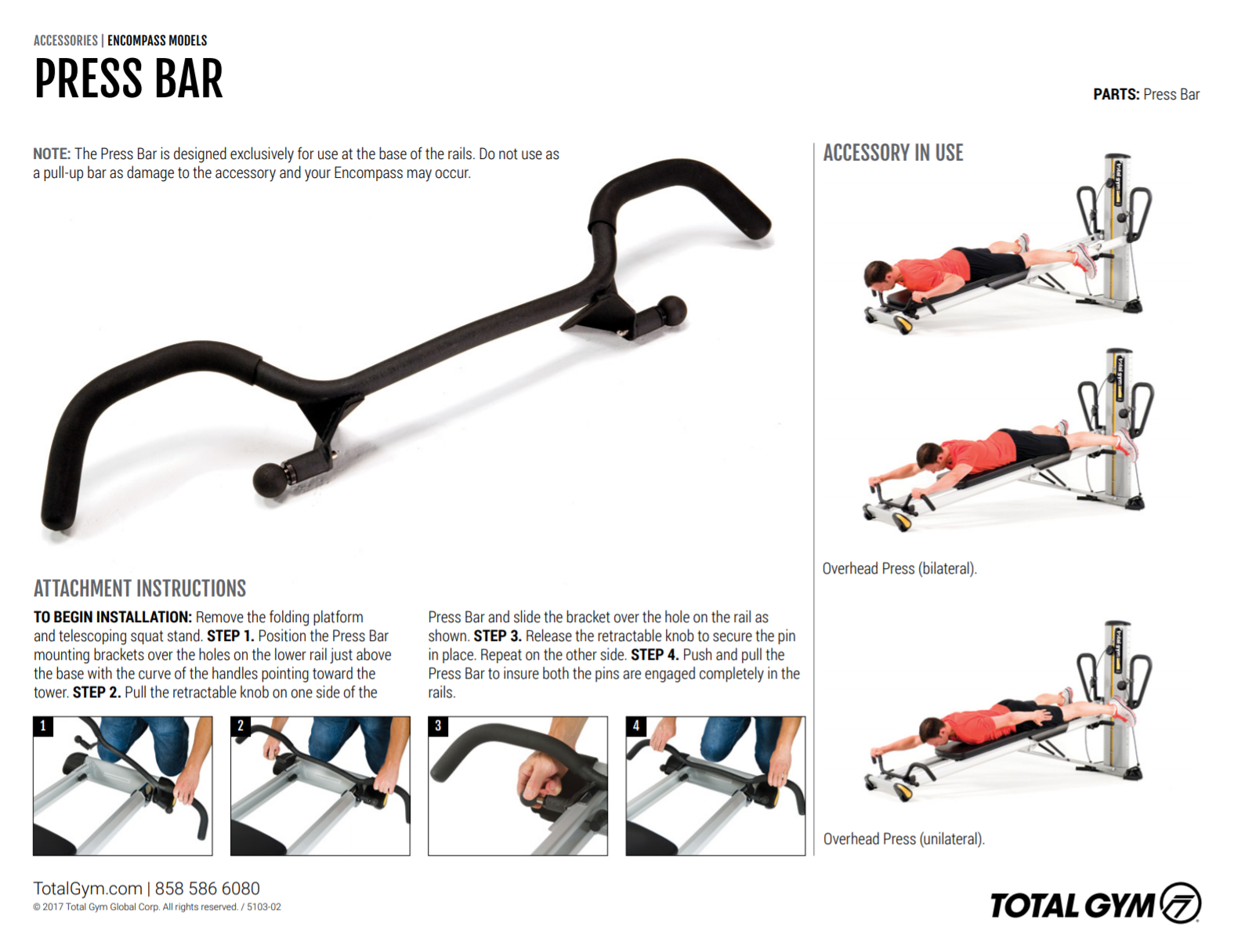 Encompass press bar accessory는 Shouder press, Push-up, Swan dive등의 그립(Grip) 안정성을 도와주어 보다 질높은 동작을 제공합니다.